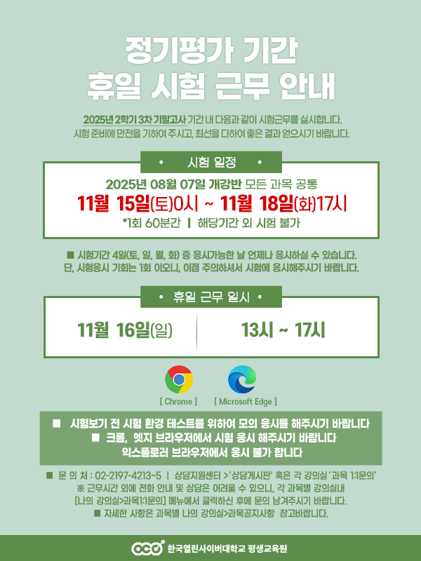 정기평가 기간 휴일 시험근무 안내(2025년 2학기 3차 기말고사)