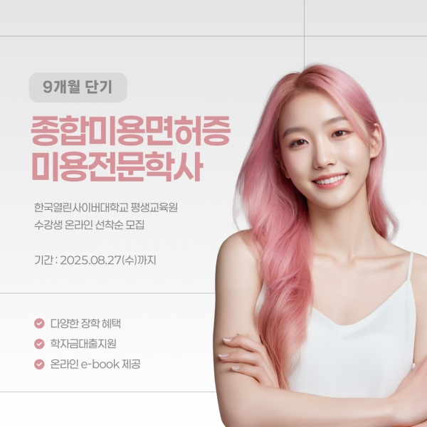 한국열린사이버대학교 평생교육원이 오는 8월 27일(수)까지 종합미용면허증 과정 수강생을 모집한다. 개강은 8월 28일(목)이며, 고등학교 졸업자라면 누구나 지원 가능하다.