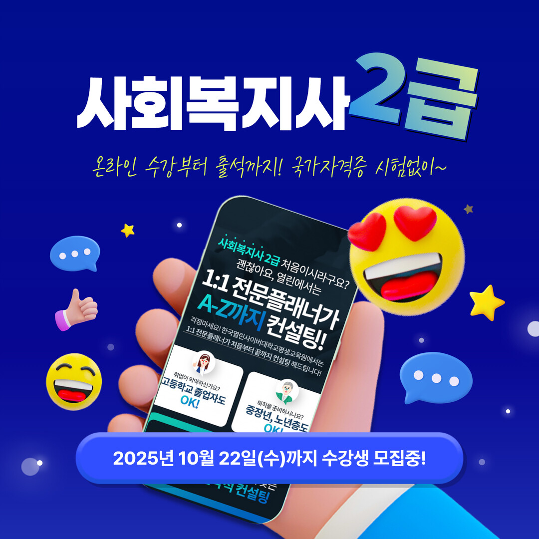 한국열린사이버대학교 평생교육원이 사회복지사 2급 자격증 과정 수강생을 오는 10월 22일(수) 자정까지 모집한다. 본 과정은 10월 23일(목) 개강하며, 온라인 이론 수업과 현장 실습을 연계해 직장인·중장년층 등 다양한 학습자들에게 최적화된 학습 환경을 제공한다.