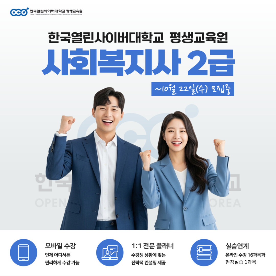 한국열린사이버대학교 평생교육원은 오는 2025년 10월 22일까지 사회복지사 2급 자격증 과정 수강생을 모집한다. 이번 과정은 10월 23일 개강하며, 모든 강의는 온라인으로 제공되며, PC와 스마트폰으로 언제 어디서든 학습이 가능해 직장인이나 가정과 학업을 병행하는 학습자들에게 적합한 것으로 평가된다.