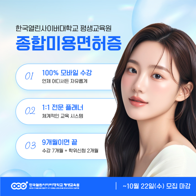 한국열린사이버대학교 평생교육원은 종합미용면허증 과정 수강생을 2025년 10월 22일까지 모집하며, 개강은 10월 23일에 진행된다.