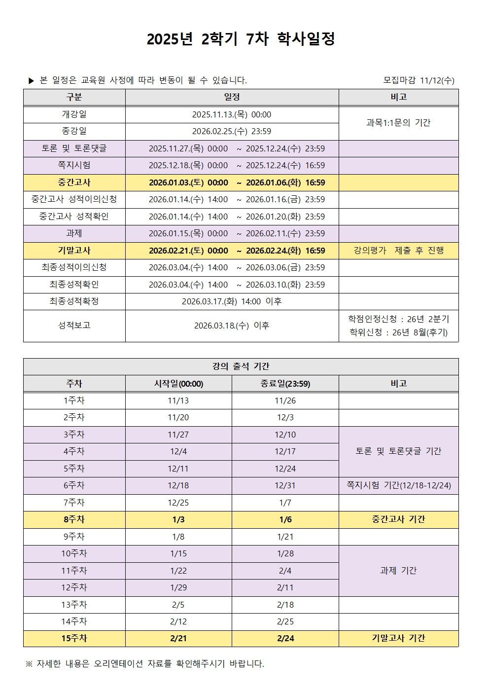 2025년 2학기 7차 학사일정 안내