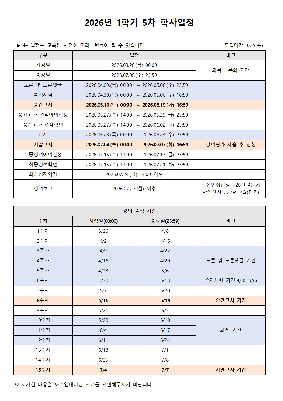 2026년 1학기 5차 학사일정 안내