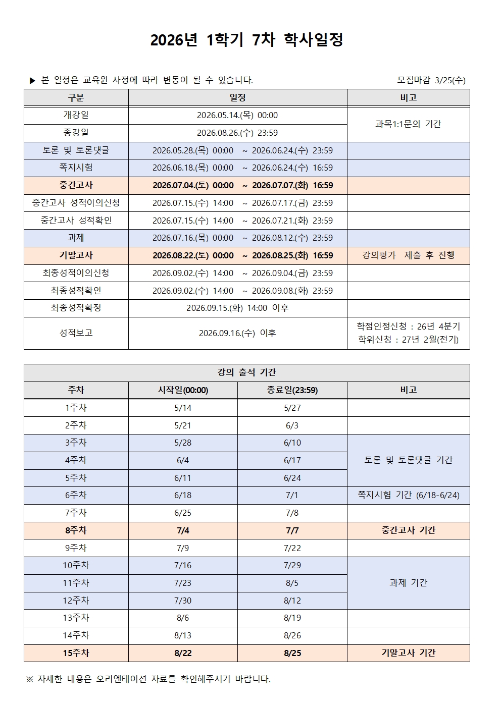 2026년 1학기 7차 학사일정 안내